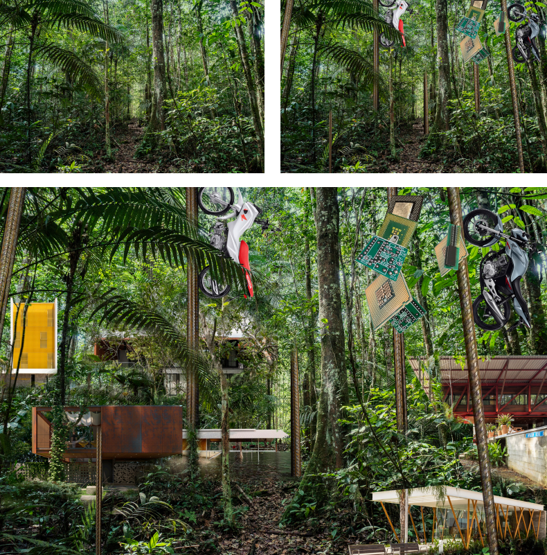 Image Fiction: Desenvolvimento: Floresta Intocada - Floresta Industrial - Integração da arquitetura produzida na cidade floresta industrial.